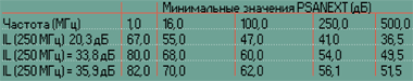 - рабочее затухание (параметр IL) на опорных частотах (для тракта). Предлагаемая характеристика соответствует действующим на сегодняшний день нормам для Класса F при условии применения кабелей Категории 7 (см. Таблицу 1);