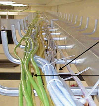 | Рисунок 4. Прокладка неэкранированных кабелей в форме регулярных жгутов (синий) с неудовлетворительным параметром PSANEXT и в виде нерегулярной связки с улучшенными параметрами по межкабельным влияниям (зеленый). |