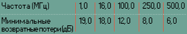 | Таблица 2. Возвратные потери на опорных частотах. |