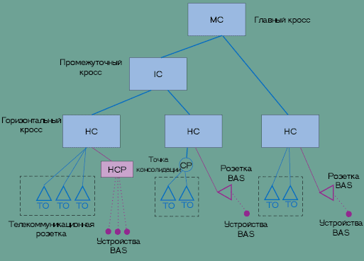 | В кабельной системе интеллектуального здания кроме обычных розеток и консолидационных точек используются розетки АСУ здания, горизонтальные точки подключения (HCP) и обслуживающие кабели для подсоединения оконечного оборудования АСУ здания — датчиков, считывателей и других устройств. За счет единой спецификации компонентов пользовательскую розетку можно задействовать как розетку АСУ здания. |