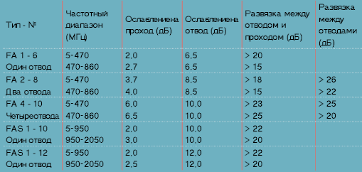Параметры широкополосных разветвителей компании Transmedia.