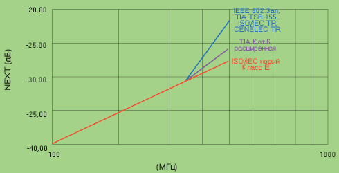 Граничные значения параметра NEXT для полного тракта передачи информации, согласно требованиям различных органов по стандартизации (по состоянию на март 2005 г.).