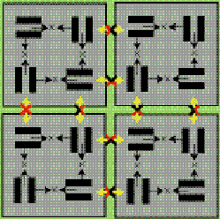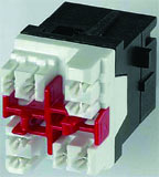 При реализации первого подхода каждая розетка разъема снабжается четырьмя индивидуальными оконцевателями витых пар, которые монтируются на тыльной стороне модуля с взаимным разворотом на 90? (см. Рисунок 4). При таком дизайне розетки любая пара контактов IDC всегда перпендикулярна любой соседней паре, в результате уровень их электромагнитной связи заметно снижается. Оригинальность и новизна такого исполнения подчеркивается некоторыми производителями путем регистрации отдельной торговой марки. Так, в розеточных модулях серии HXJ6A, входящих в состав СКС NEXTSPEED Ascent 10GbE компании Hubbell, она именуется MatriХ IDC. По сравнению с оконцевателями традиционной конструкции этот прием гарантирует увеличение значения параметра ANEXT примерно на 15 дБ во всем частотном диапазоне при его абсолютном значении на уровне не менее 70 дБ на частоте 100 МГц.