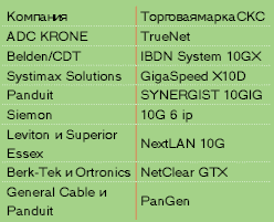 Несколько американских производителей предлагают функционально полные решения по построению 10-гигабитной неэкранированной проводки с максимальной длиной тракта 100 м. Эти решения (см. Таблицу 1) включают в себя линейные кабели, шнуровые изделия разной длины, коммутационные панели для технических помещений и информационные розетки для установки на рабочих местах пользователей. В соответствии со сложившейся в отрасли традицией, решению присваивается собственная торговая марка для облегчения его продвижения на рынке. В ее наименовании часто присутствует индекс 10 или 10G, который указывает на возможность поддержки передачи сигналов 10BaseT.