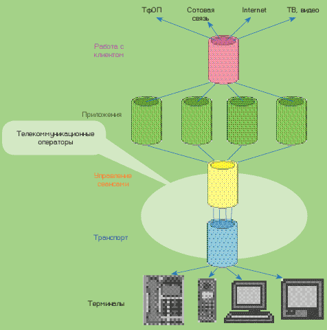 За телекоммуникационными операторами останутся только транспорт (общий для разных услуг — ТВ, Internet, голосовые сервисы) и управление услугами. Приложения и работа с клиентами окажутся вне сферы их деятельности, полагают в «ТрансТелеКоме».