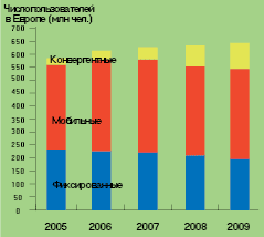 | Рисунок 2. Прогноз роста числа абонентов конвергентных, мобильных и фиксированных сетей (по данным Frost & Sullivan). |