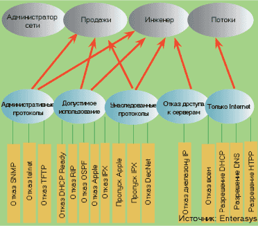 Часто коммутаторы доступа поддерживают лишь простые правила для виртуальных локальных сетей (Virtual Local Area Network, VLAN), в то время как в пределах VLAN какой-либо контроль отсутствует. Это ставит целый ряд болезненных вопросов. Что же происходит, когда кто-то подключает к виртуальной сети неавторизованный сервер протокола DHCP и после этого регистрируется с требуемыми полномочиями? Как при использовании программного телефона на компьютере различать голосовой трафик и трафик данных? Как остановить распространение «червя» по виртуальной сети? Итак, политика должна быть более содержательной — в идеале создаваемые правила для виртуальной локальной сети, управления доступом, для приоритетов и ограничения скорости должны быть применимы к специфическому трафику авторизованного пользователя или устройства.