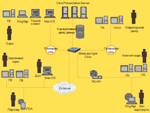 При подключении удаленных пользователей к выполняемым на сервере приложениям Citrix предлагает заметно большую гибкость, чем Microsoft и прочие конкуренты.