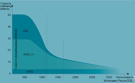 Выигрыш в производительности у различных вариантов DSL существенно зависит от протяженности медного.