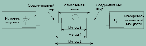 Границы объекта измерений (измеряемой линии) при использовании различных вариантов метода вносимых потерь (стандарт IEC 61280-4-1, многомодовые тракты).