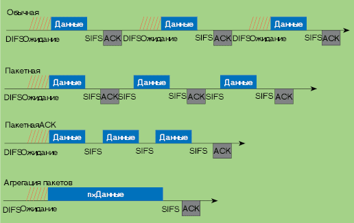 Различные способы экономии времени при передаче данных по беспроводной сети: пакетная передача, подтверждение пакета и агрегация пакетов.