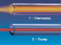 В области ввода в многомодовый волоконный световод оптическое излучение расщепляется на несколько лучей, каждый из которых распространяется по собственной траектории. Отдельный луч называется модой, а волокно, где может существовать ряд направляемых мод, многомодовым. Излучение светодиода отличается от излучения лазера своей очень широкой диаграммой направленности (см. Рисунок 1). Сильно расходящийся пучок света при вводе в многомодовый световод «переполняет» его сердцевину и возбуждает в ней большое количество мод. Лазер же возбуждает в волокне относительно немного мод, причем они распространяются преимущественно в области, примыкающей к оси сердцевины.