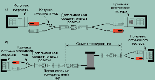 Схема реализации метода одного тестового шнура при измерениях одноканальным прибором затухания объекта тестирования с разъемами MT-RJ: а) процедура определения опорного значения; б) процедура измерения.
