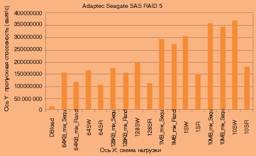 Контроллер Adaptec в конфигурации RAID 5 с жесткими дисками Seagate достиг пропускной способности 375 Мбайт/с.