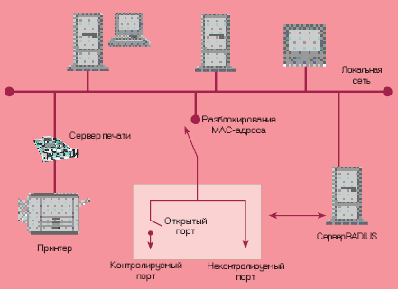 Схематичное представление аутентификации 802.1х с сервером RADIUS в сети.