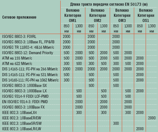 Максимальные длины оптических кабельных трактов в зависимости от типа волокна и рабочей длины волны.