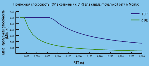 | Передача CIFS и TCP по соединению со скоростью 6 Мбит/с. Здесь основным источником проблемы становится CIFS, поскольку пропускная способность падает сильнее. В случае приложений, которые ведут себя в глобальной сети лучше, главным фактором является время задержки. |