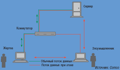 Значительная опасность для внутрикорпоративной сети исходит от спуфинговых атак. Их цель заключается в том, чтобы перехватить трафик между двумя хостами. В случае спуфинга протокола разрешения адресов (Address Resolution Protocol, ARP) злоумышленником отправляются поддельные пакеты данных для манипуляций адресными записями участников коммуникационного процесса. Такие атаки с нелегальным посредником очень опасны, поскольку пакеты данных, которые один заслуживающий доверие компьютер отправляет другому, без ведома отправителя и получателя проходят через третий компьютер (см. Рисунок 1), где они могут быть скопированы или изменены (атака Мan-in-the-Middle). Вероятность идентификации жертвы и агрессора в результате подобных дейст-вий после переписывания кэша прак-тически равна нулю.