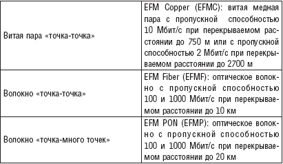 С учетом существующих реалий в качестве среды передачи предпочтение было отдано медным витым парам и оптическому волокну. Эти две разновидности EFM получили названия EFMC (Copper) и EFMF (Fiber).