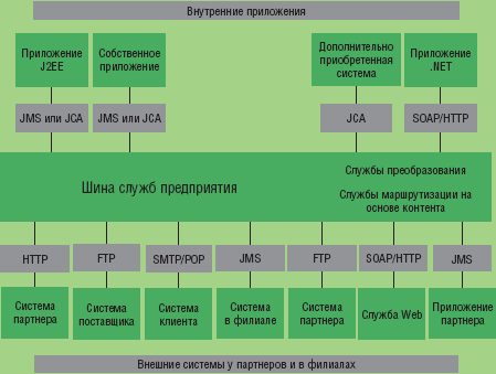 ESB должна быть достаточно гибкой, чтобы поддерживать разные типы соединений и протоколы (HTTP, TCP/IP, SOAP), в частности взаимодействие службы Web и приложения МОМ. В рамках корпоративной магистрали обмена сообщениями программное обеспечение должно поддерживать как стандарты служб Web (WS-Reliability или WS-ReliableMessaging) и компоненты J2EE, к примеру службу обмена сообщениями Java (Java Messaging Service, JMS), так и ориентированное на обмен сообщениями нестандартное промежуточное программное обеспечение и архитектуру коннекторов J2EE (J2EE Connector Architecture, JCA) для соединения с адаптерами приложений без интерфейсов служб Web. Из сообщества Java выделилась деловая интеграция Java (Java Business Interation, JBI), где описывается, каким образом интеграционные компоненты разных ESB сопрягаются друг с другом.