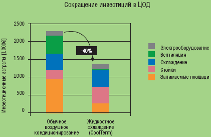 | Рисунок 7. Система Knuerr CoolTherm с жидкостным охлаждением дает возможность сэкономить примерно 40% инвестиций в ЦОД (по данным производителя). |