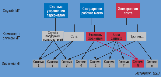 | Рисунок 1. При отказе системы ИТ отображение технических взаимосвязей позволяет провести анализ того, какие компоненты ИТ, а значит, и службы ИТ пострадали. |