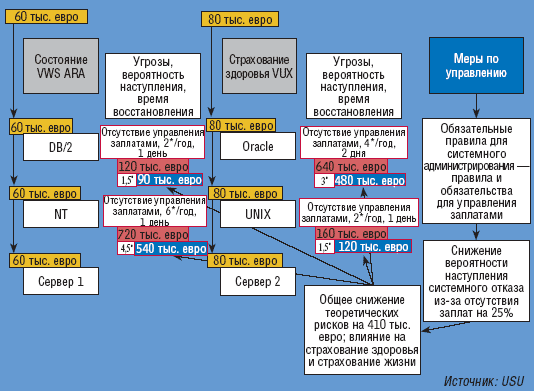 Следующий пример касается области производственных рисков. Страховая компания в рамках анализа бизнеса составила матрицу взаимодействия прикладных систем и зависимостей между ними и базовыми системами, а также прочими компонентами ИТ. В отношении отдельных деловых областей, в частности страхования жизни или здоровья, можно определить потенциальные риски. Если из-за запоздалого запуска обновления системы безопасности UNIX произойдет системный отказ, он среди прочего повлияет на функционирование Oracle и, таким образом, на весь деловой процесс (см. Рисунок 2).