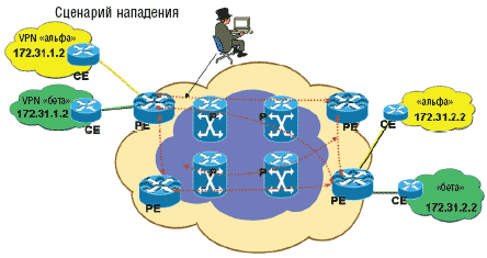 Инжекция (ввод) предварительно маркированного трафика из клиентской сети. Злоумышленник, находящийся в клиентской сети, может попытаться проникнуть в другую виртуальную частную сеть, передав «своему» устройству РЕ пакеты, уже содержащие метку. Речь идет о метке, на основании которой пакет направляется в другую VPN. Но как написано в RFC 2547: «Пакеты с метками из не заслуживающих доверия источников не принимаются магистральными маршрутизаторами».