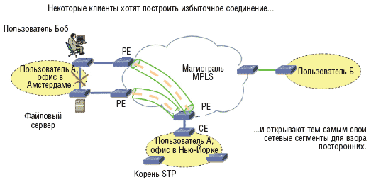 Эксплуатируемые клиентами устройства РЕ. Если клиент самостоятельно эксплуатирует устройство РЕ, это ставит под угрозу всю модель безопасности магистрали, поскольку у него появляется потенциальная возможность доступа к виртуальным частным сетям других клиентов. Авторам известны случаи, когда состоятельным клиентам разрешалось использование собственных устройств РЕ.