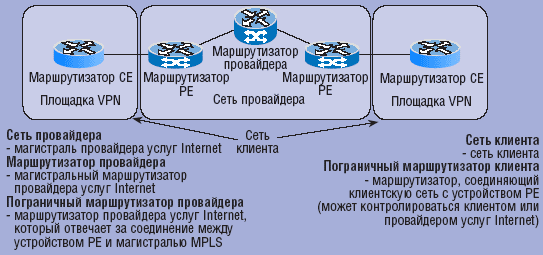 В первую очередь различие проводится между провайдерской сетью, где применяется MPLS, и клиентской, которая использует соответствующую службу, но не имеет никакого отношения к выделению меток или соответствующему продвижению данных. Транзитный пункт между клиентом и провайдером со стороны провайдера называют пограничным устройством провайдера (Provider Edge, PE), а со стороны клиента — пограничным устройством клиента (Customer Edge, CE).