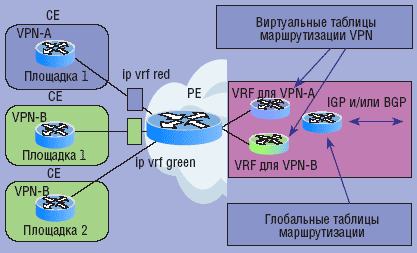 Устройство РЕ обычно обслуживает нескольких клиентов, для чего помимо своей таблицы маршрутизации, которая в этом случае называется «глобальная», ведет дополнительные, специфичные для каждой VPN виртуальные экземпляры маршрутизации и продвижения данных (Virtual Routing and Forwarding Instance, VRF). Благодаря подобной виртуализации можно сделать так, чтобы разные клиенты пользовались одним и тем же адресным пространством или разными протоколами маршрутизации (см. Рисунок 2 и 3).