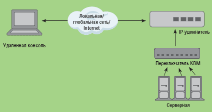 Для удаленного управления одним компьютером предлагается и другой вариант — встроенная плата дистанционного управления. Например, модуль ATEN Altusen IP9001 представляет собой встраиваемый контроллер PCI для дистанционного управления по TCP/IP. По существу — это удлинитель IP KVM и USB, причем удаленное рабочее место можно подключать как через сеть, так и через модем. Аналогичные функции, но уже в качестве внешнего устройства, выполняет однопортовый DKVM-IP1 от D-Link. Подобные однопортовые и многопортовые решения предлагаются для управления по IP устройствами с интерфейсом RS-232 (коммутаторами, маршрутизаторами, УАТС). Так называемые «IP-удлинители», например CN-6000 от ATEN или KVM KIPS-01 от Rextron, подключаются к системному блоку вместо консоли, а порт Ethernet позволяет «вынести» консоль на неограниченное расстояние (см. Рисунок 3).