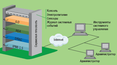 | Рисунок 6. Многопортовое устройство Cyclades OnBoard соединяется по Ethernet с сервисными процессорами HP iLO, IPMI, Dell DRAC и IBM RSA, собирая и консолидируя информацию о состоянии серверов. Такое устройство имеет один IP-адрес и направляет весь служебный трафик по выделенной сети на рабочую станцию администратора. Оно поддерживает аутентификацию, авторизацию и шифрование трафика, протоколирование данных, распознает различные типы событий и сообщает о них администратору, позволяет задавать допустимые пороговые значения для сенсоров. |