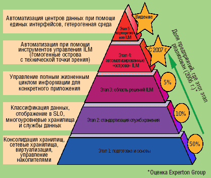 Тем не менее половина участников опроса провела предварительные технические работы и подготовила основу для будущего внедрения ILM. Этот базис является содержанием первой фазы в пятиступенчатой модели, с помощью которой SNIA описывает путь к операционной среде на основе ILM (см. Рисунок 1 и врезку «Поэтапное введение ILM»).