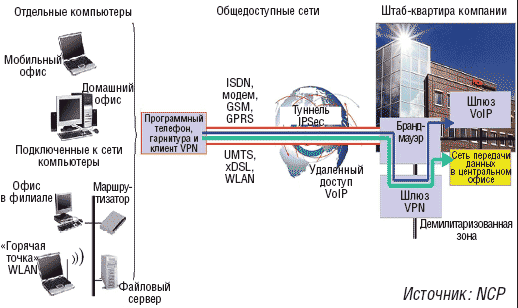 В случае передачи голоса по IP через Internet каждый пользователь должен заботиться о безопасности своих голосовых данных. Наряду со специфичными решениями конкретных производителей, которые, однако, часто не в состоянии взаимодействовать друг с другом, стандарт IPSec предлагает вместе с мощной аутентификацией сквозное шифрование всех пакетов IP. Этот единый подход не зависит от приложения и позволяет добиться прозрачной интеграции мобильных сотрудников в корпоративную сеть. Необходимое условие заключается в том, чтобы клиентское программное обеспечение VPN обладало всеми требуемыми функциями безопасности и коммуникации для обеспечения качества услуг. Инфраструктура VPN может служить в качестве универсальной платформы для всех последующих коммуникационных решений на базе IP, в частности для видеотелефонии (видео по IP).