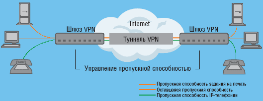Похожая ситуация возникает и с IP-телефонией. Для снижения затрат на телефонные переговоры предприятия все чаще задействуют туннели VPN и для передачи голоса по IP. Тогда разговоры между филиалами не стоят практически ничего. Если во время телефонного разговора пропускная способность не гарантируется, то он может быть прерван любой объемной загрузкой. Но, выделив на эти цели определенную пропускную способность, можно добиться того, чтобы телефонным разговорам по IP предоставлялось достаточное количество ресурсов.