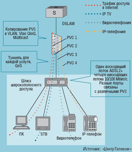В этой связи общей тенденцией становится подключение оборудования доступа (DSLAM) к оборудованию оператора по оптическому каналу и перенос его ближе к абонентам, что дает возможность увеличить скорость на более коротких участках «меди». Такая комбинация FTTx и DSL позволяет оптимизировать структуру сети, считают в Huawei, и предоставить большее количество услуг. При этом операторское оборудование должно поддерживать все услуги Triple Play (см. Рисунок 6), гибкое управление и разносторонние политики SLA.