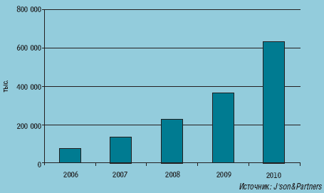 На первом этапе не обойтись без существенных затрат, поэтому проект может приносить очень малую прибыль. Предложение VoD позволяет повысить доход, а промежуточным этапом перехода к услуге становится «виртуальный кинозал» (Pay-per-View). В России уже реализуются и эти две услуги, и «виртуальный видеомагнитофон». Совершенно новое качество предоставляют услуги HDTV. Их внедрения в нашей стране в J'son&Partners ожидают в 2008 г. Переход к последнему (самому прибыльному) этапу относят к 2010-11 г., когда у нас будет насчитываться более 600 тыс. пользователей IPTV (см. Рисунок 8). За год-полтора операторам предстоит накопить «критическую массу» для развертывания новых услуг.
