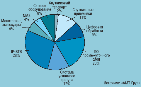 | Рисунок 9. Структура капитальных затрат оператора, предоставляющего услуги интерактивного ТВ, на первом этапе — 500 абонентов. |