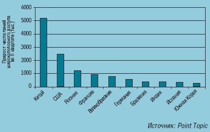 | Рисунок 2. Прирост количества линий широкополосного доступа во II квартале 2006 г. Россия пока не входит в десятку лидирующих по этому показателю стран мира — рост не более 1 млн линий в год. |