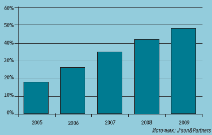 Распределение широкополосных подключений в России остается крайне неравномерным. По данным J'son&Partners, на Москву приходится 45%, на Московскую область — 10%, лишь 5% — на С.-Петербург и 40% — на остальные регионы. После инициированного «МТУ-Интел» (с его услугой СТРИМ) бума 2005 г. в столице продолжаются приток новых абонентов и активное строительство сетей, однако две трети новых подключений осуществляется в регионах, где имеется большой неудовлетворенный спрос на услуги широкополосного доступа. Что касается динамики московского рынка (см. Рисунок 4), то, по прогнозам J'son&Partners, к концу 2006 г. каждая четвертая квартира в столице будет иметь широкополосный доступ в Internet (очевидно, к таковому аналитики относят доступ со скоростью от 128 Кбит/c). За год «проникновение» услуги увеличится с 18 до 25%, а в 2009 г. приблизится к 50%. Доходы от услуг широкополосного доступа уже сейчас сопоставимы с доходами от местной телефонии (см. Рисунок 5), а в 2008 г. могут сравняться с ними. В частности, МГТС практически исчерпала источники увеличения доходов от услуг телефонии, поскольку тарифы вплотную приблизились к стоимости услуг мобильной связи.