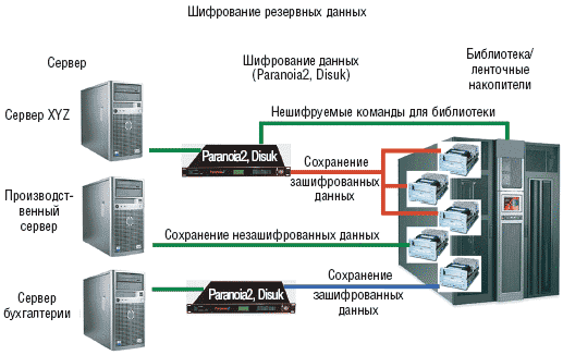 В данном сегменте рынка работают лишь несколько поставщиков. Один из примеров — компания Disuk с линейкой продуктов Paranoia2: устройств, которые устанавливаются между системой и ленточным или оптическим накопителем либо библиотекой. В зависимости от потребностей пользователя подключение осуществляется через интерфейсы SCSI, iSCSI или Fibre Channel (FC). Устройство полностью прозрачно для системы и при определенных способах подключения может служить даже в качестве моста (к примеру, от SCSI к FC). Таким образом, отпадает необходимость вмешательства в системную среду, а резервные данные остаются максимально защищенными. То же самое происходит при использовании интегрированного решения того же производителя для небольших предприятий. Оно состоит из ленточного накопителя, по желанию дополняемого встроенным в него устройством шифрования данных.