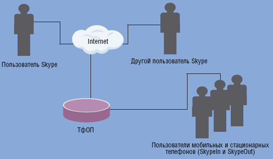 За короткое время решение завоевало популярность среди пользователей, так как обеспечивало бесплатное общение при приемлемом качестве, причем возможности коммуникации ограничивались только «тонкостью» пользовательского канала и стоимостью трафика у провайдеров Internet. Помимо поддержки звонков внутри сети разработчики реализовали функции вызова на традиционные стационарные и мобильные телефоны (SkypeOut) и в обратном направлении (SkypeIn) (см. Рисунок 1). Сейчас в системе зарегистрировано более 100 млн пользователей, причем около 5 млн используют КПК, а 40% прибегают к помощи Skype во время деловых командировок и для связи в территориально распределенных компаниях.
