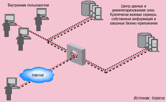 | Рисунок 1. Брандмауэры для приложений Web защищают как от внешних, так и от внутренних атак. |