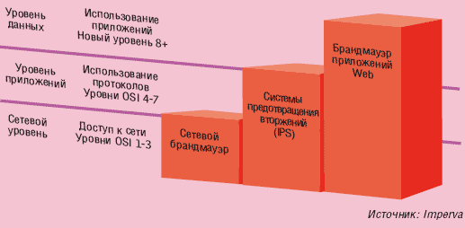 | Рисунок 3. Брандмауэры для приложений Web расширяют зону обеспечения безопасности, распространяя ее с сетевого уровня до уровней данных и приложений. |