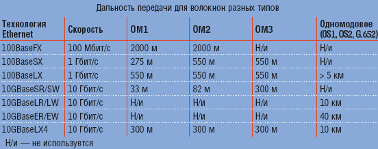 | Таблица 1. Оптические разновидности технологии Ethernet. |