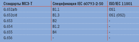 Основными источниками спецификаций на одномодовое волокно являются стандарты МСЭ-Т серии G.65x и спецификация IEC 60793-2-50 (см. Таблицу 3). В «основополагающем» для отрасли СКС международном стандарте ISO/IEC 11801 описан только один класс одномодового волокна OS1. В предварительном варианте стандарта ISO/IEC 24702 (Generic Cabling for Industrial Premises) упоминается предназначенный для поддержки еще более скоростных приложений класс OS2. Если потери для волокна OS1 специфицированы на уровне 1 дБ/км (для длин волн 1310 и 1550 нм), то для OS2 они должны составлять всего 0,4 дБ/км.