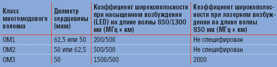 Типы многомодового волокна часто обозначают как OM1, OM2 и OM3 (как в Таблице 1) в соответствии со стандартом ISO/IEC 11801. Основные характеристики разных типов этих волокон приведены в Таблице 2.