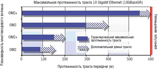В отличие от процедуры тестирования по способу DMD метод minEMBc позволяет вычислить все десять значений максимально возможной дальности передачи десятигигабитного потока (в пределах рабочей области стандартных трансиверов 10 Gigabit Ethernet), которые могут быть использованы в реальной практике построения сетей. Метод minEMBc может быть расширен для получения количественной информации с учетом других факторов: скажем, различных скоростей передачи данных и свойств источника излучения, включая длину волны и спектральную ширину. Это значительно увеличивает эффективность процесса дальнейшего совершенствования как активного оборудования, так и пассивной части тракта передачи (см. Таблицу 1).