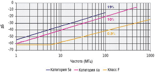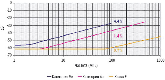 Из Рисунков 1 и 2 можно сделать вывод о том, что в случае передачи по кабельной системе Категории 5е/ Класса D на частоте 100 МГц 23,4% мощности сигнала переходит в наводку на ближнем и дальнем концах (параметры PS-NEXT и PS-FEXT). Ситуация заметно улучшается, когда проводка строится на элементной базе Категории 6а (системы Класса ЕА), так как доля теряемой мощности на данной частоте падает до 11,4%. Однако и в этом случае не гарантируется, что при совместном использовании одного кабеля однотипными приложениями последние будут функционировать без существенного влияния друг на друга. Совсем другая ситуация наблюдается в кабельных системах Класса F: на частоте 100 МГц в суммарные переходные помехи (PS-NEXT и PS-FEXT) преобразуется только 1,6% мощности сигнала. В результате пользователь может не беспокоиться о том, что сигналы, передаваемые по двум различным, надежно изолированным парам, будут подвергаться нежелательным переходным воздействиям со стороны друг друга. Таким образом, по имеющему четыре пары кабельному тракту Класса F могут одновременно передаваться сигналы нескольких однотипных или разнотипных приложений.